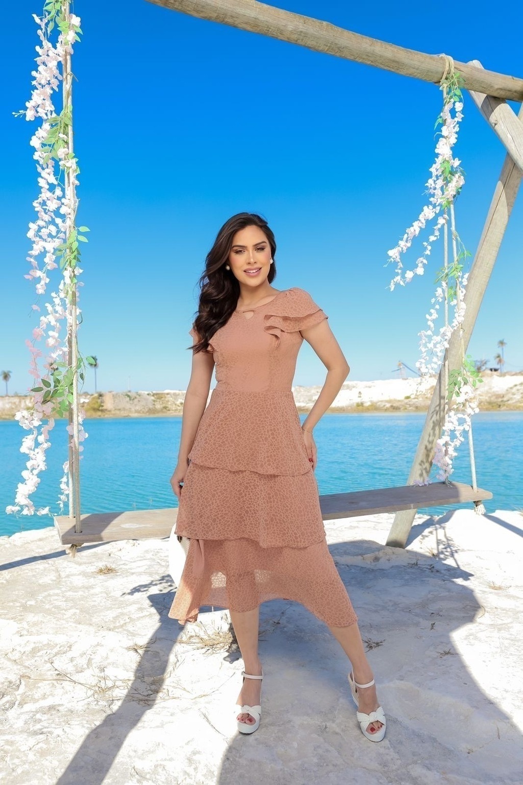 Leve e fluido, o nosso vestido Antonella é uma peça elegante em chiffon premium de alta qualidade em maquinetado. Decote redondo com recortes e manga dupla flaer, saia com babados discretos com caimento excelente e leve. Possui zíper invisível atrás. Completamente forrado, zero Transparência